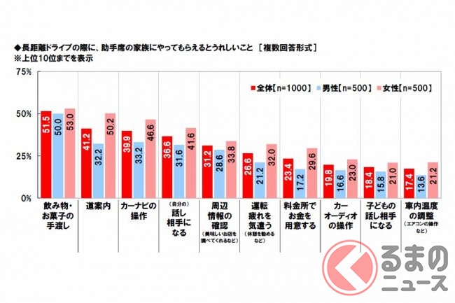 助手席の家族にやってもらえるとうれしいことは、「飲み物・お菓子の手渡し」が51.5%で最も高くなりました。