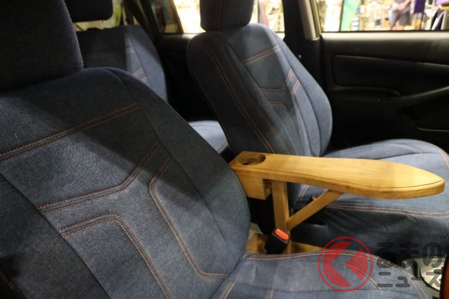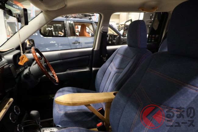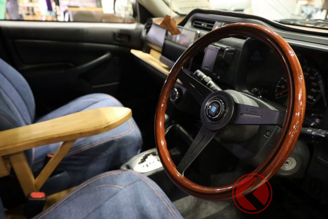 「内装もほとんど自社のオリジナルパーツでできており、デニムシートカバーやウッドハンドル、木製のアームレストなど、さまざまなパーツでこだわりを持って制作しています。