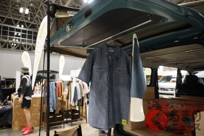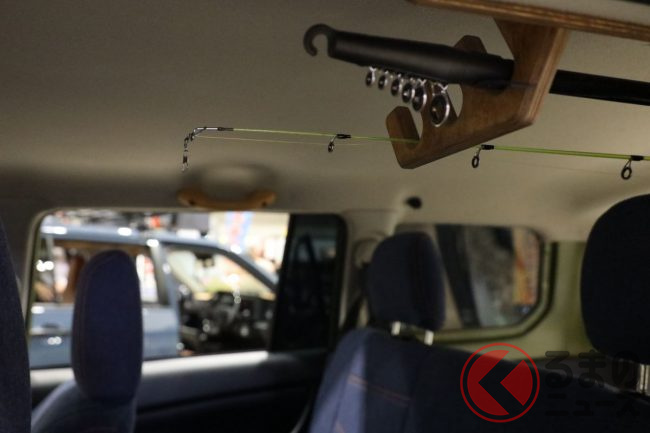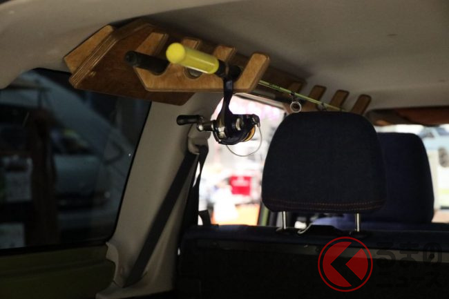 「さらにこだわりポイントとして、釣り竿を収納するロッドホルダーを取り付けたり、ハンガーラックを取り付け、服をハンガーに吊るすことができるようにしたり。