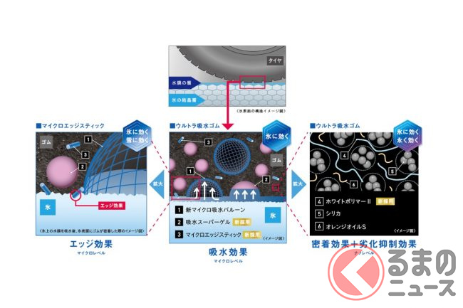 従来品「アイスガード シックス」で定評のあった「永く効く=性能持続性」も兼ね備えているほか、アイスガード セブン専用のコンパウンド「ウルトラ吸水ゴム」がマイクロレベルで効果的に吸水することで、氷の上で滑る原因となる薄い水膜をすばやく除去し、そして氷に密着するといいます。加えて、アイスガード史上最大の接地面積とエッジ量を確保した専用トレッドパターンには「クワトロピラミッドグロウンサイプ」を採用するなど、コンパウンドとトレッドパターンの相乗効果で氷の上でもちゃんと効く、高い旋回性能と制動性能を実現したとのことです。