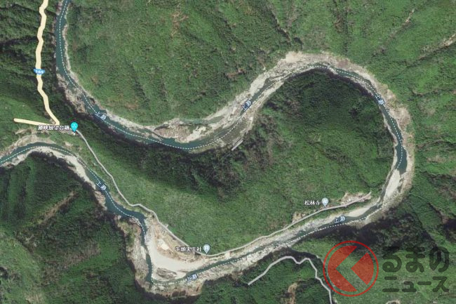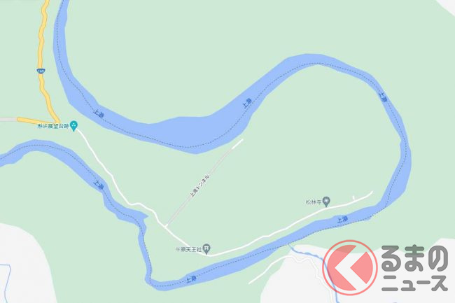 トンネルはクルマ同士がすれ違えるごく普通のものですが、そのトンネルを出ると道は突然終わり、あとは山と川が見えるだけ。一体なんのために造られたのでしょうか。