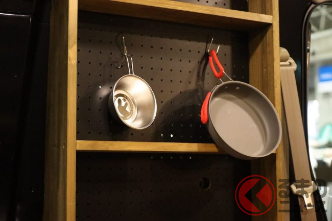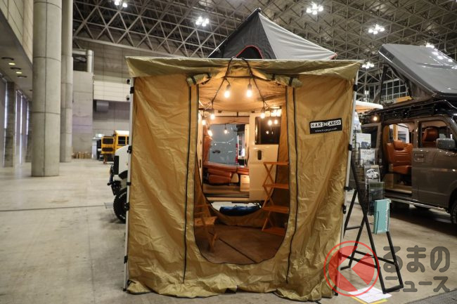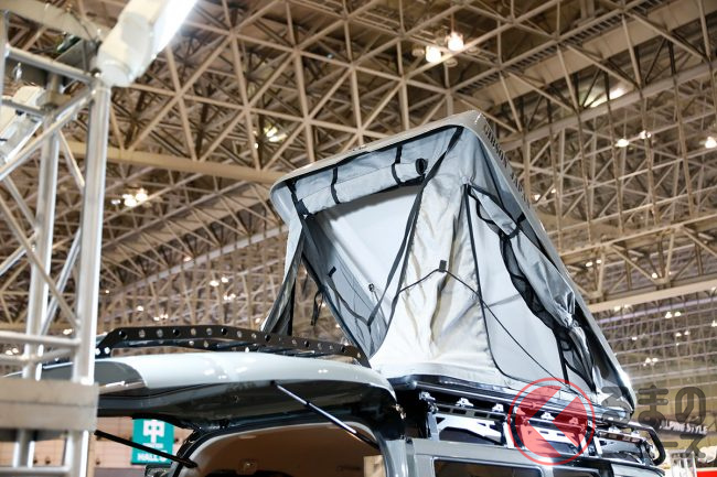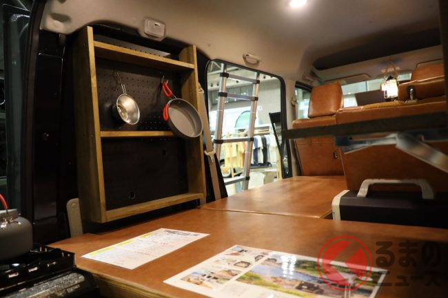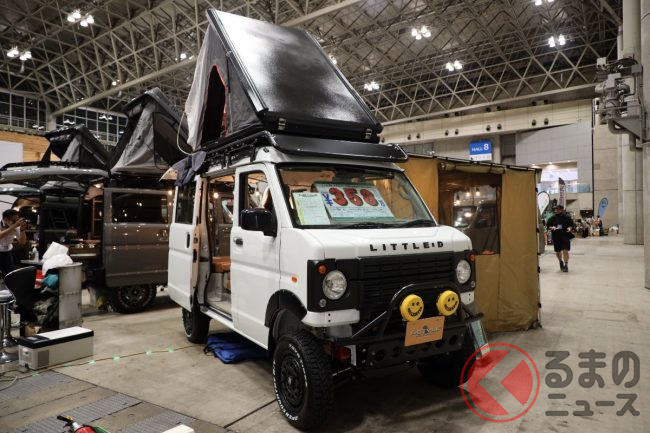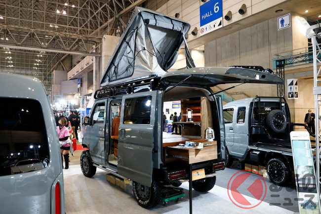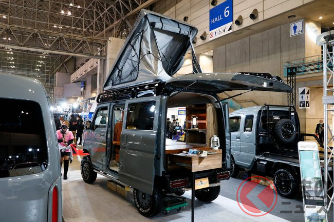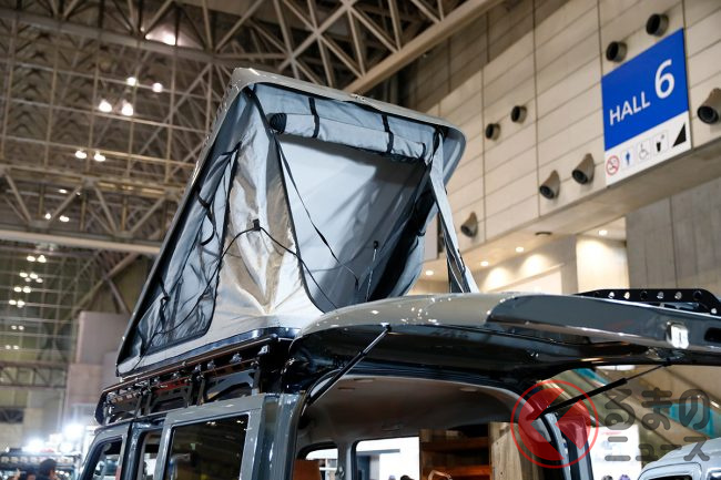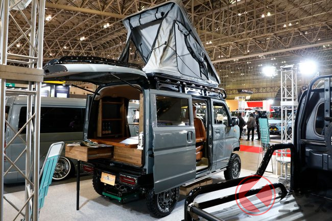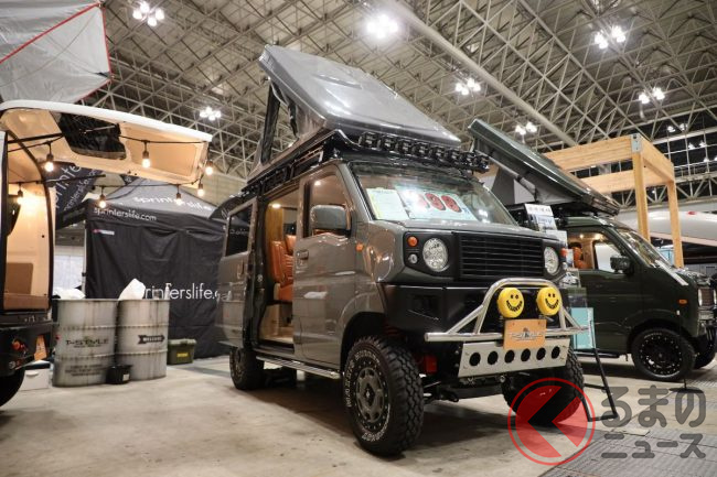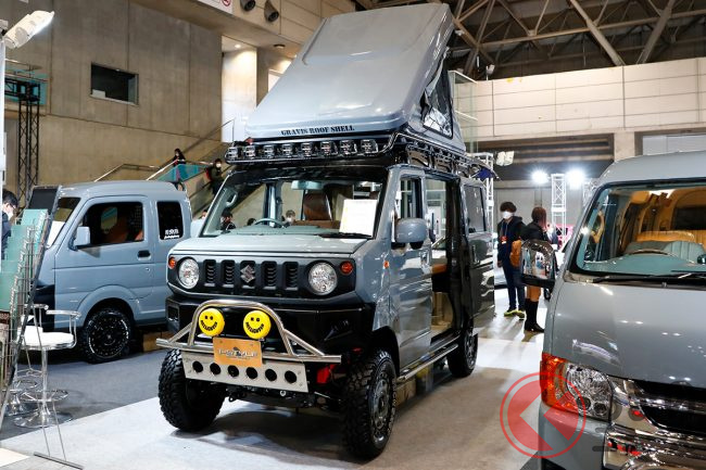 「スズキ『エブリイ』を同じくスズキ『ジムニー』のフェイスに大きく変化させたカスタムのキャンピングカーとなっています。
