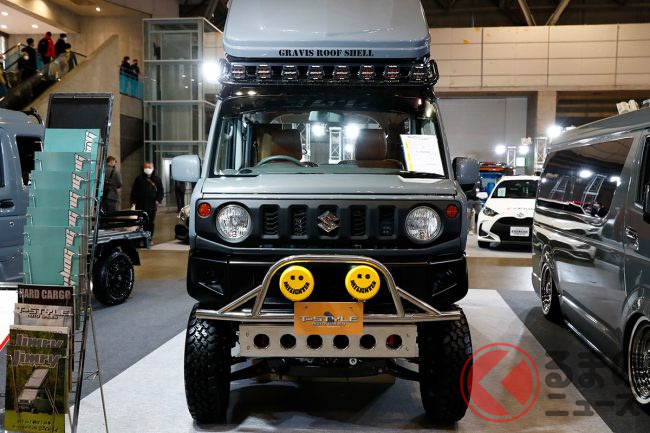2022年8月6日から7日の2日間にかけて、アソビとクルマが融合したイベント「アソモビ」が幕張メッセにて開催されました。そのなかで、スズキ「エブリイ」を「ジムニー」風にフェイスにカスタムしたクルマが注目を集めていました。