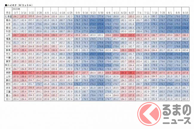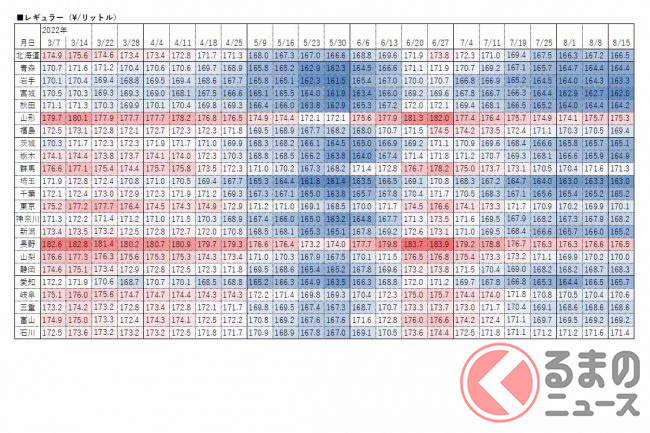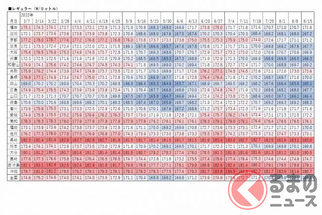 資源エネルギー庁は2022年8月17日、レギュラーガソリンの15日時点の店頭小売価格(消費税込)を発表しました。