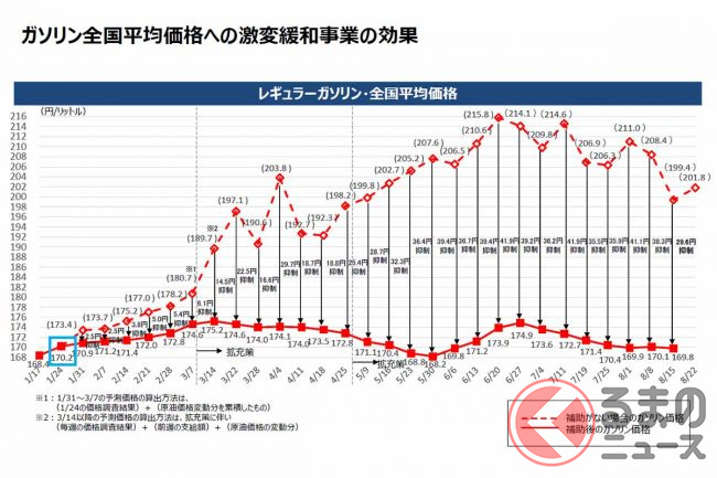 なお、経産省によると、補助金がない場合のレギュラーガソリンの全国平均小売価格は、8月8日時点で1リットル199.4円と算出しており、来週22日の時点では201.8円まで上がると見ています。