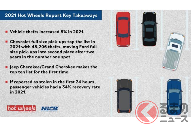 そんなNICBが公表したホットホイール車両盗難レポートには、盗難車のランキングとその盗難件数が記載されています。