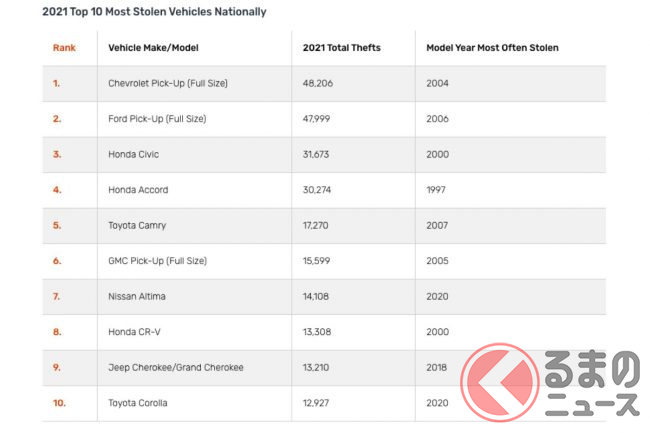 ランキングでは、シボレーのフルサイズピックアップトラックが4万8206台で1位、フォードのフルサイズピックアップトラックが4万7999台で2位となっており、米国でもっともよく盗まれるのはシボレー「シルバラード」やフォード「F-150」など、トヨタで言えば「タンドラ」サイズの大型のピックアップトラックであることがわかります。