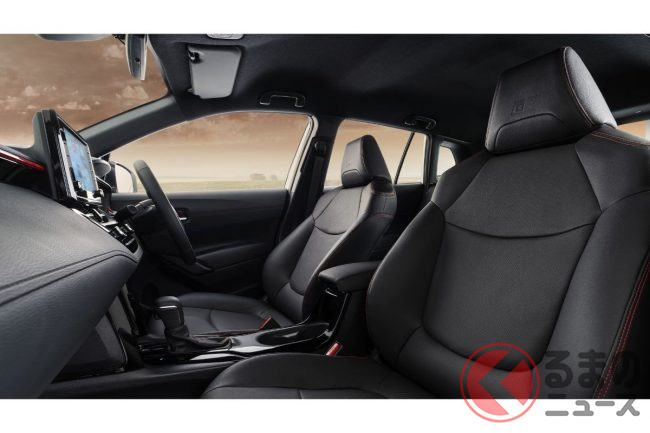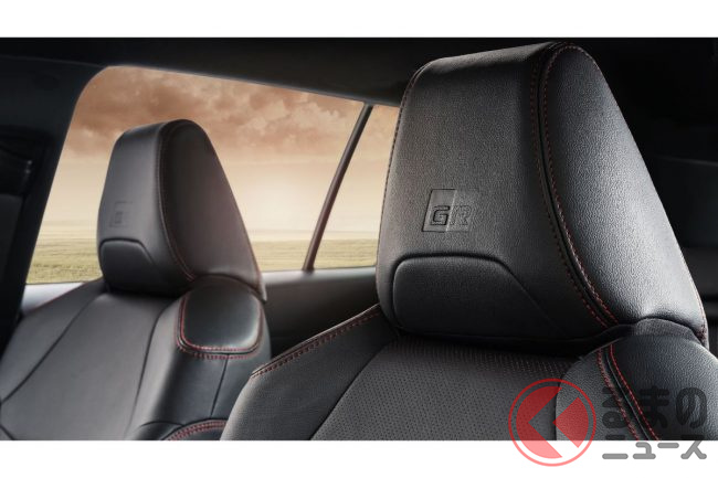 インテリアには、ダッシュボードに左右エアコン送風口を繋ぐ赤いアクセント加飾に加えて、GRロゴをエンボス加工したブラックレザーシート、さらに随所には赤いステッチが施されています。