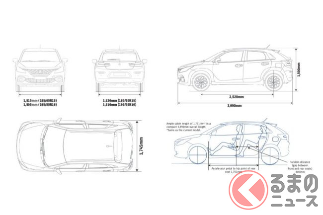 ボディサイズは全長3990mm×全幅1745mm×全高1485mm。ホイールベースは2520mmで最小回転半径5.1mです。