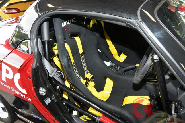 同車は、かつてのデ・トマソ仕様をどこか彷彿とさせるレッドとブラックの専用カラーリングが施され、ニフコと共同開発したカーボン仕様のフロアアンダーカバーや、AGCと共同開発した曇り防止の熱線入りフロントガラスなどのアイテムが採用されています。