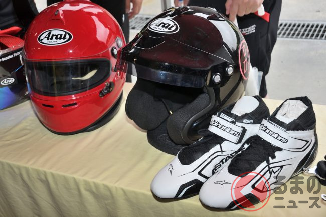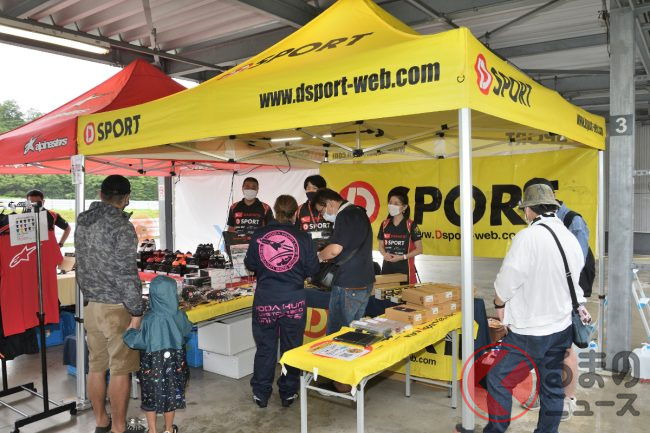会場では、D-SPORTやアルパインスターズなどのレーシングパーツ、レーシングギアの展示や販売も実施されています。D-SPORTのデモカーや全日本ラリー選手権に参戦中のマシンも展示され、走行の合間にそれら車両の細かい点をチェックする参加者の姿も見られました。