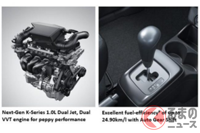 エンジンも660ccを上回る1リッターデュアルジェットデュアルVVTエンジン(最高出力66.62馬力・最大トルク89Nm)を搭載。トランスミッションはAGS(自動MT)とMTから選択できます。