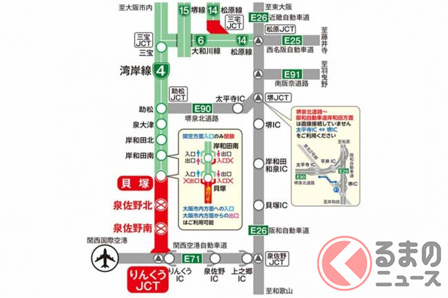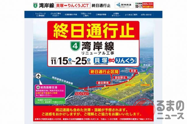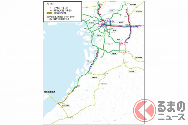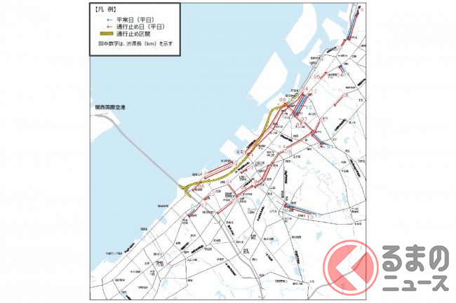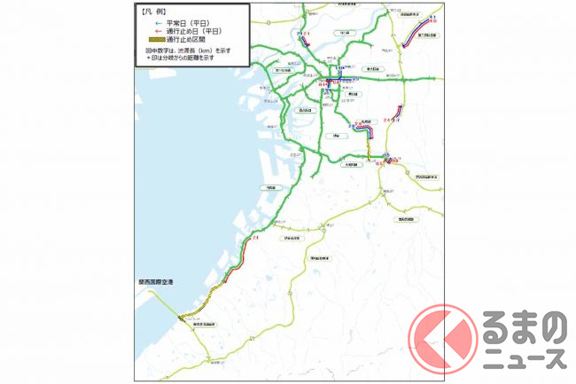 この期間中、区間内にある泉佐野北出入口、泉佐野南出入口に加え、区間外にある岸和田南入口(南行)も閉鎖されます。
