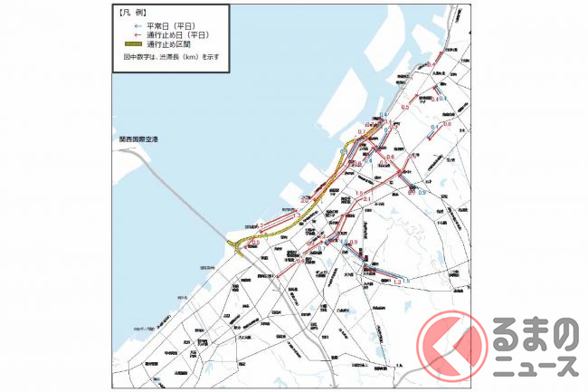高速道路は通行止めの末端となる貝塚出口付近で、平日17時台だと約7km。一般道だと4号湾岸線の迂回路となる大阪臨海線や国道26号などで断続的な渋滞がそれぞれ発生する可能性があります。