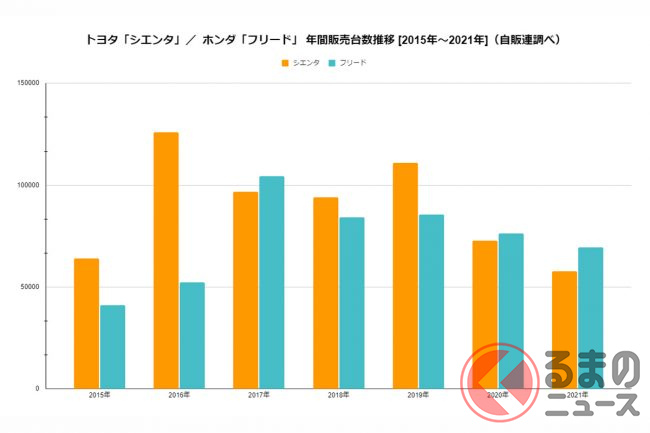 2020年の年間販売台数では、シエンタが7万2689台、フリードが7万6283台とほぼ同数に並び、翌2021年にはシエンタ5万7802台、フリード6万9577台と、大きく差をつけられています。
