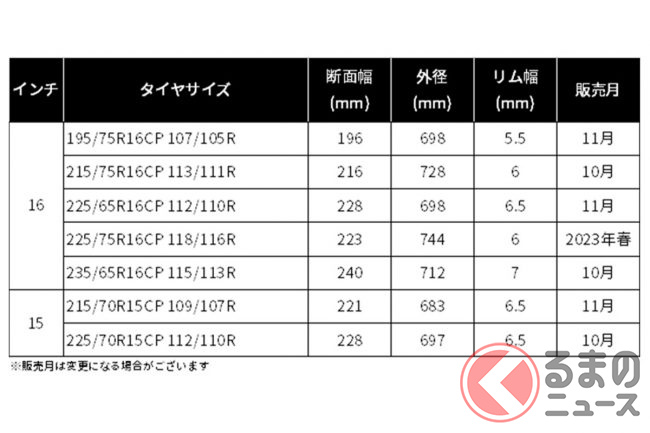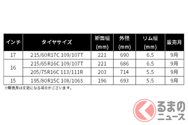 バン・ライトトラック用の「MICHELIN AGILIS CROSSCLIMATE」は15、16、17インチの計4種類のサイズラインアップで2022年9月18日(日)発売予定、キャンピングカー専用の「MICHELIN CROSSCLIMATE CAMPING」は15、16インチの計7種類のラインアップで同年10月18日(火)発売予定とのことです。