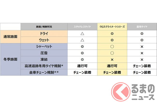 いずれも安定した排水性能を持つトレッドパターン(タイヤの溝のこと)や、幅広い温度に対応するコンパウンド(タイヤ接地面の材質)を採用し、国際基準で定められたシビアスノータイヤ要件に適合しているため、高速道路の冬用タイヤ規制の対象区間でもタイヤチェーンの取り付けが不要となります(全車チェーン規制時はチェーン装着が必要です)。