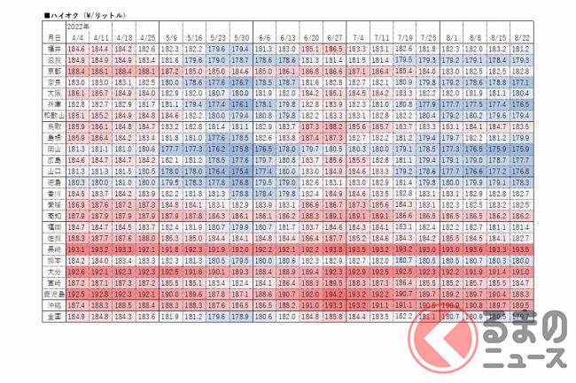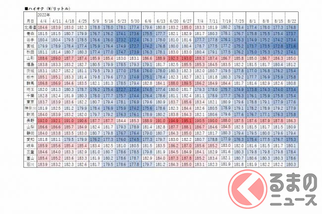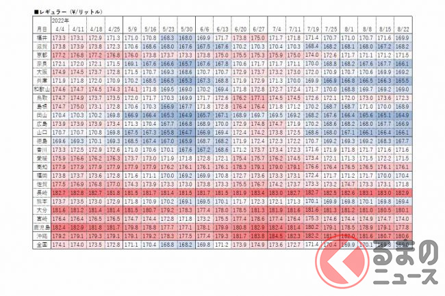 資源エネルギー庁は2022年8月24日、レギュラーガソリンの22日時点の店頭小売価格(消費税込)を発表しました。