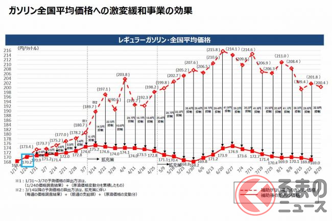 なお、経産省によると、補助金がない場合のレギュラーガソリンの全国平均小売価格は、8月22日時点で1リットル201.8円と算出しており、来週29日の時点で200.4円に推移すると見ています。