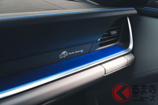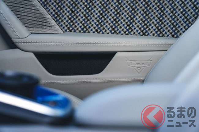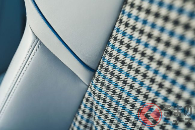 外装色に使用されているサリーブルーメタリックをインテリアトリムにも使用。またシートなどには3色のペピタハウンドトゥースファブリックとチョークカラーのレザー、そしてスピードブルーのステッチを組み合わせ採用しています。