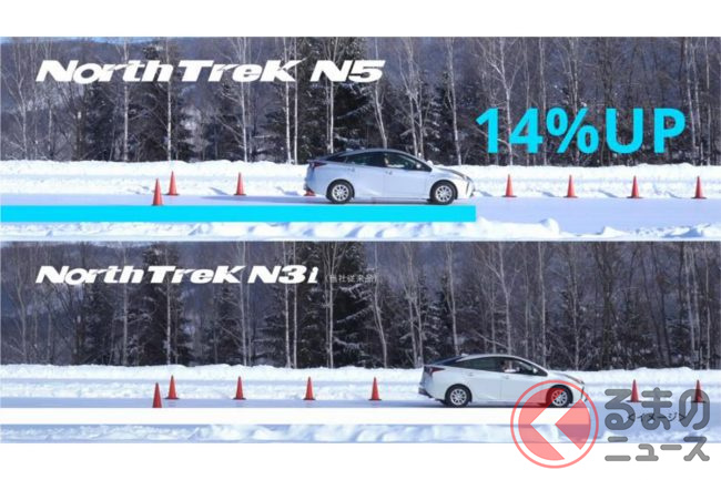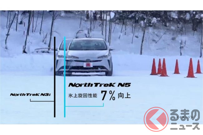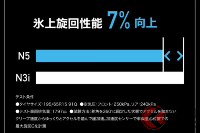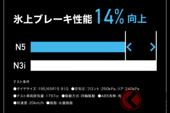 「N5」は、「N3i」の基本性能はそのままに、左右非対称パターンを採用することで「North Trek」史上最高の氷上性能を実現しているといい、「N3i」との比較では、氷上ブレーキ性能で14%、氷上旋回性能で7%、向上しているそうです。