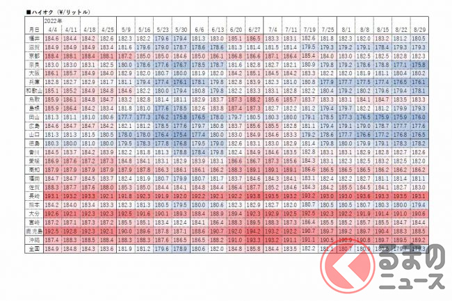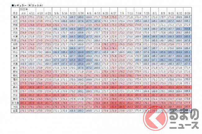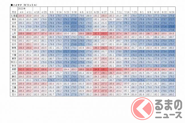 資源エネルギー庁は2022年8月31日、レギュラーガソリンの29日時点の店頭小売価格(消費税込)を発表しました。