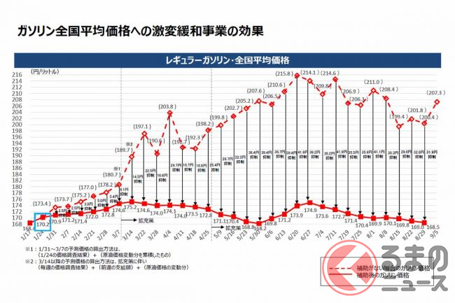 なお、経産省によると、補助金がない場合のレギュラーガソリンの全国平均小売価格は、8月29日時点で1リットル200.4円と算出しており、来週9月5日の時点で207.3円に推移すると見ています。