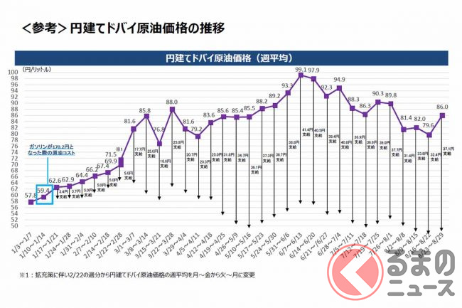 ガソリン価格の高騰を受け、政府は石油元売り企業に補助金を出す価格抑制策を実施。ガソリン、軽油、灯油、重油を対象に2022年1月27日から1リットルあたり5円、3月10日から25円を上限として支給しています。
