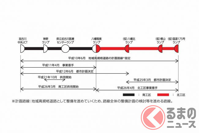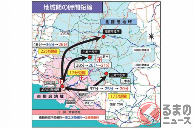加古川市役所から小野市役所までの所要時間は、未整備時の38分から、全通後は21分まで短くなると試算されています。