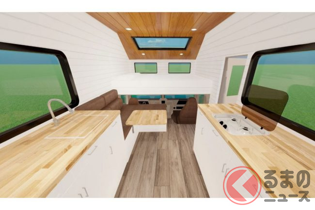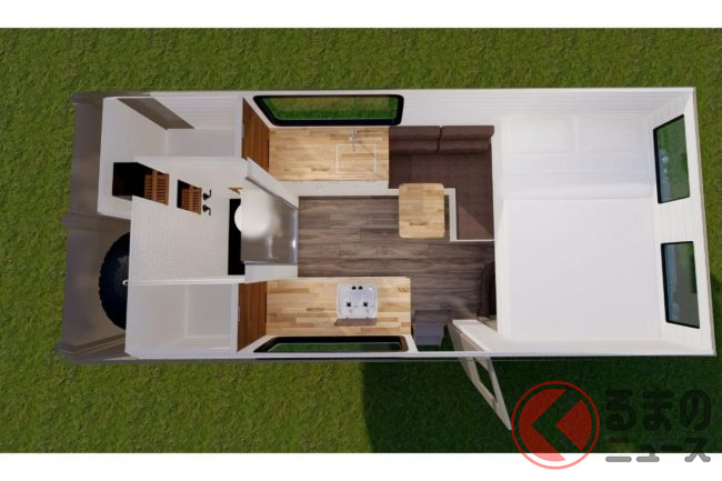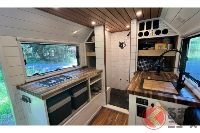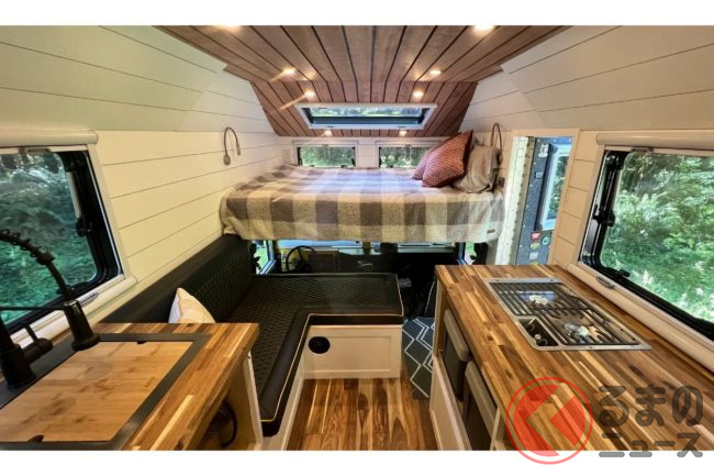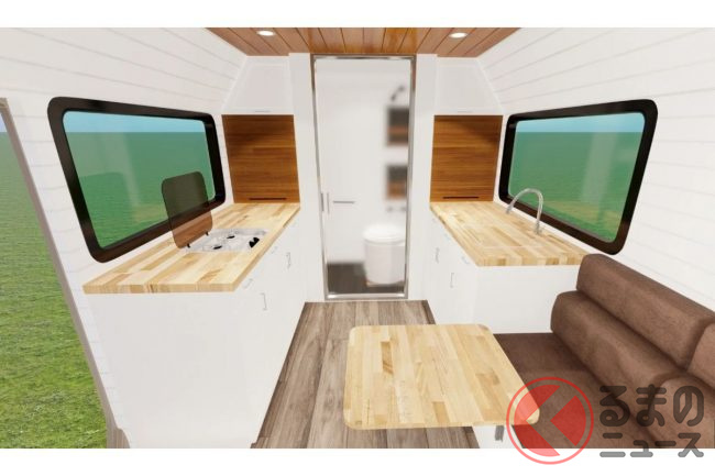 キャンパーシェルの中には、クイーンサイズベッドを備えるほか、キッチンやシャワー、トイレなども装備されています。