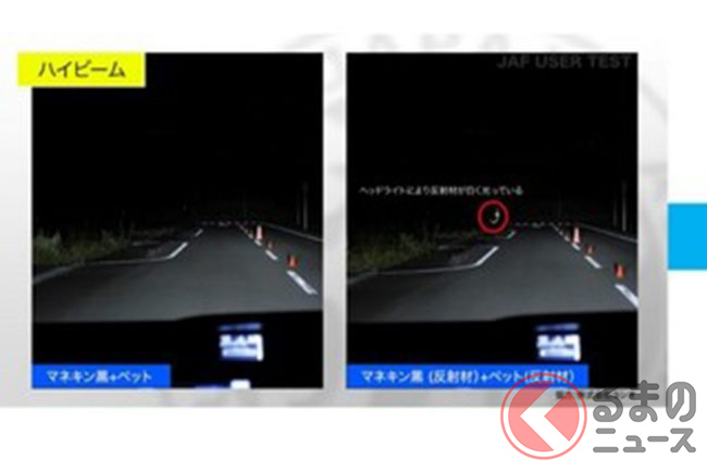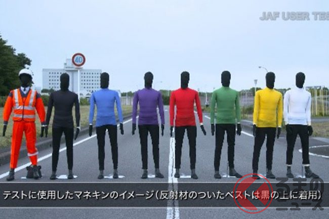 テストでは様々な色の服を付けたマネキンと、黒に反射材、JAF制服(上下 反射材付)という反射材を含めた状態で検証が行われました。