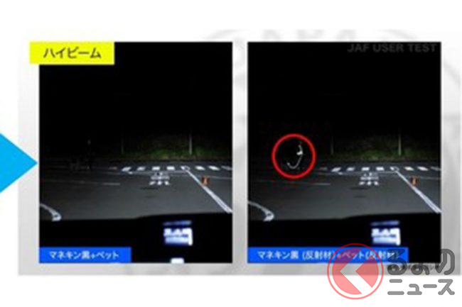 夜の道を走るクルマから歩行者はどの程度で視認されるのか、という点について、JAFは過去に実際にテストをおこない検証しています。