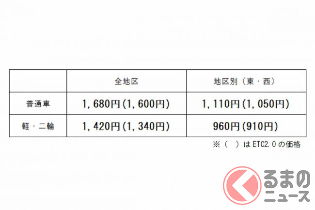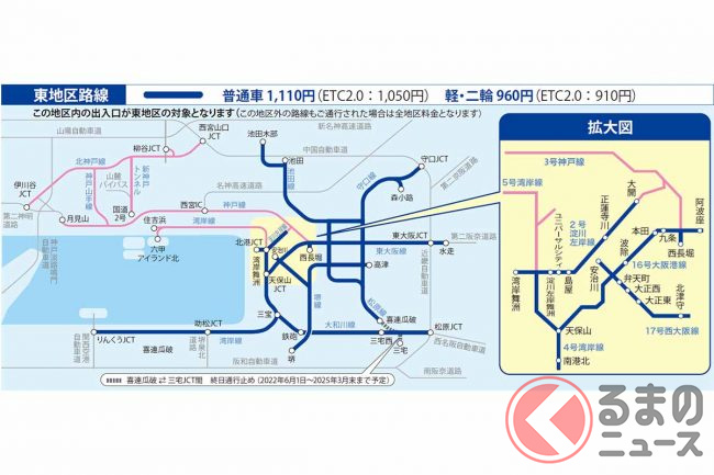 概ね2号淀川左岸線より大阪側の「東地区」や、神戸側の「西地区」は、それぞれ普通車が1110円、軽・二輪が960円です。