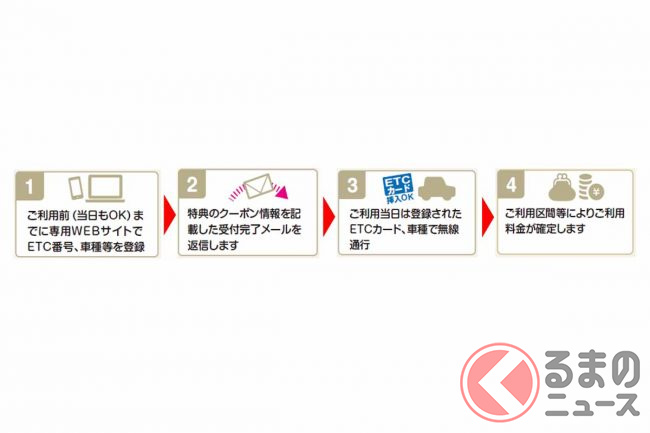 申し込みは、事前に専用サイトでETC番号や車種などを登録します。特典として、阪神地域の提携施設で使えるクーポンが用意されます。