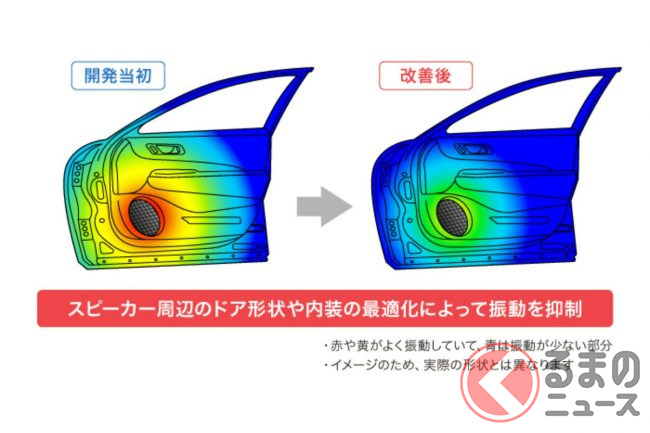 この解析結果をもとに、デンソーテンはトヨタと共同でスピーカー周辺のボディ形状などを最適化し、スピーカー駆動時の不要な振動を低減することで、雑味の無いクリアな音を実現しています。