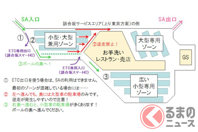 「一度通り過ぎたら戻れない!?」 難解すぎる高速SA・PAの“駐車場ルート”「逆走」に注意