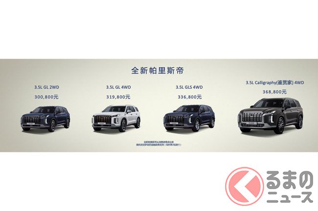 新型パリセードの中国市場における価格は30万800元から36万8800元(約610万円から約747万円)です。