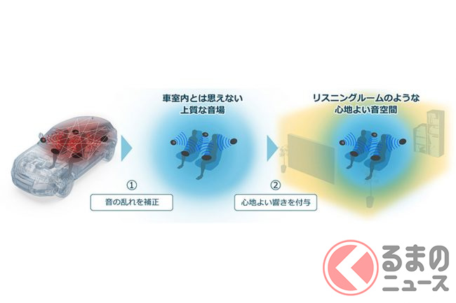 加えて、リスニングルームで音楽を聴いた時の反射音を、到来方向まで忠実に車室内で再現することで、車室外まで広がるような心地よい音空間を実現します。