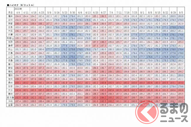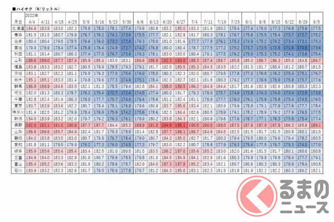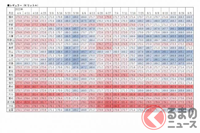 資源エネルギー庁は2022年9月7日、レギュラーガソリンの5日時点の店頭小売価格(消費税込)を発表しました。