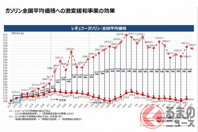 ガソリン4週ぶり値上がり レギュラー平均169.6円! 「補助金なし価格」も200円以上で推移
