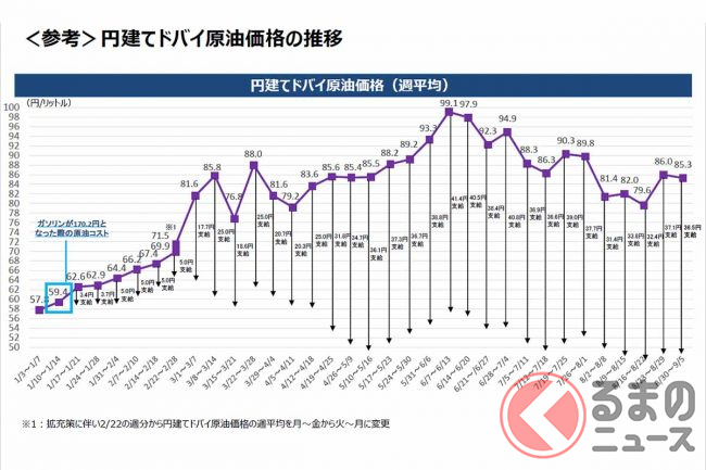 ガソリン価格の高騰を受け、政府は石油元売り企業に補助金を出す価格抑制策を実施。ガソリン、軽油、灯油、重油を対象に2022年1月27日から1リットルあたり5円、3月10日から25円を上限として支給しています。