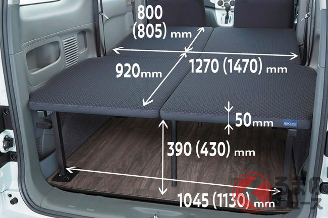 新型NV200バネット マルチベッド(バン仕様)のベッド幅は、長さ1725mm、幅1470mm。ベッド厚さは50mmで、ベッド下の高さは430mmを確保します。