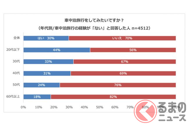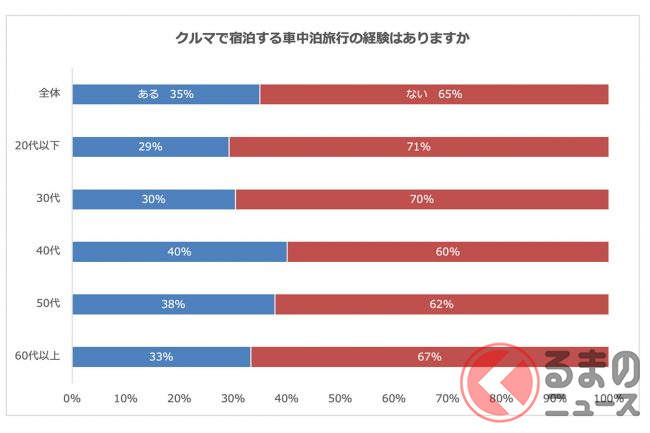 調査ではまず、クルマで宿泊する車中泊旅行の経験があるか聞きました。
