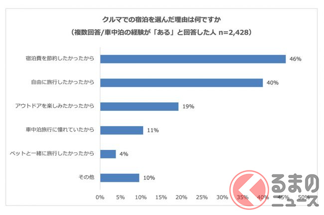 続いてクルマでの宿泊を選んだ理由を聞いたところ、1位が「宿泊費を節約したかったから」46%、2位は「自由に旅行したかったから」40%でした。