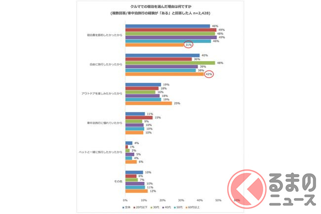 年代別で見ると、60代以上のみ「自由に旅行したかったから」が「宿泊費を節約したかったから」を上回っています。