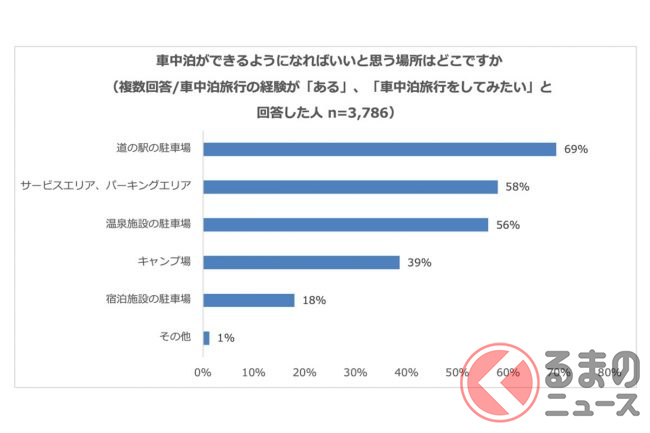 なお車中泊旅行ができるようになればいいと思う場所の1位は「道の駅の駐車場」で69%、2位は「サービスエリア、パーキングエリア」58%、3位は「温泉施設の駐車場」56%となっています。