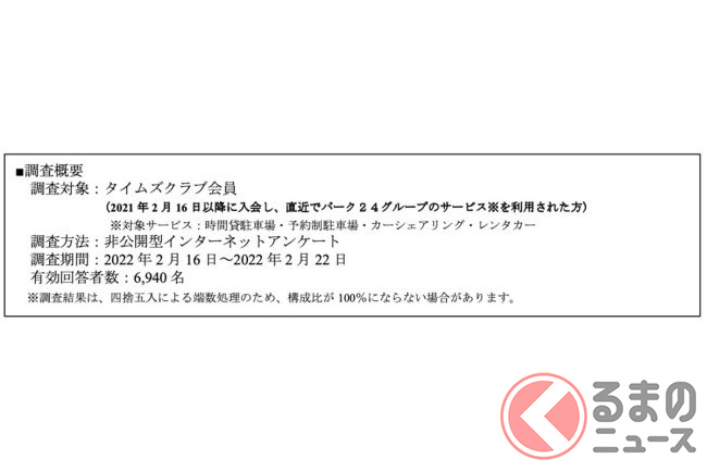 アンケート調査は、パーク24の駐車場やカーシェアリング、レンタカーなど、クルマに関わるサービスの利用者を対象としたものです。