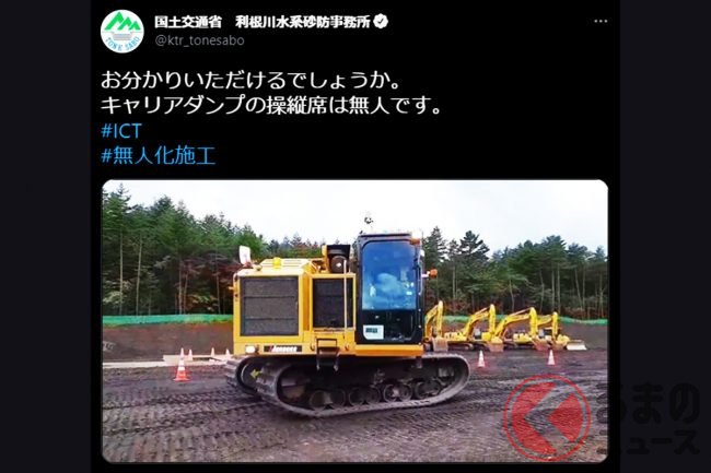 建設現場で動いているダンプに誰も人が乗っていなかったら……。そんなことも、ICT技術を活用した建設機械ならあり得ます。国土交通省 利根川水系砂防事務所が、遠隔操作で動くキャリアダンプの動画を公式SNSに投稿しました。