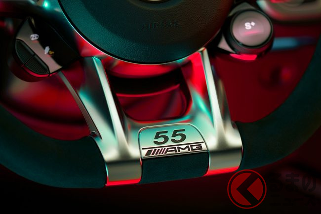 外装は黒と白のツートンカラー。車体側面には、AMGのエンブレムであるアップルマークが、ステッカーになって貼られています。