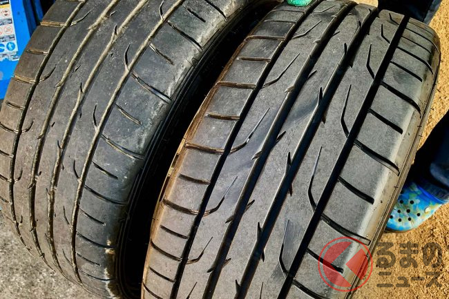 タイヤは同じ位置のまま使用していると、それぞれの場所に特有の偏摩耗が発生。フロントの場合はサイドショルダー部分、リアの場合はセンター部分などの摩耗が進みます。